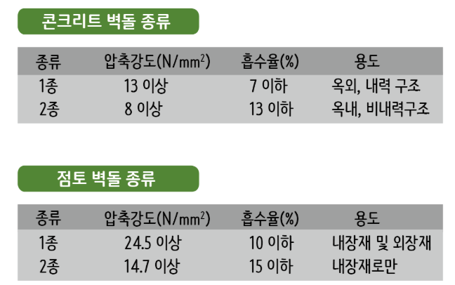 - 내구성 : 기후나 환경에 따라 내구성이 요구되는 벽돌을 선택해야 합니다.